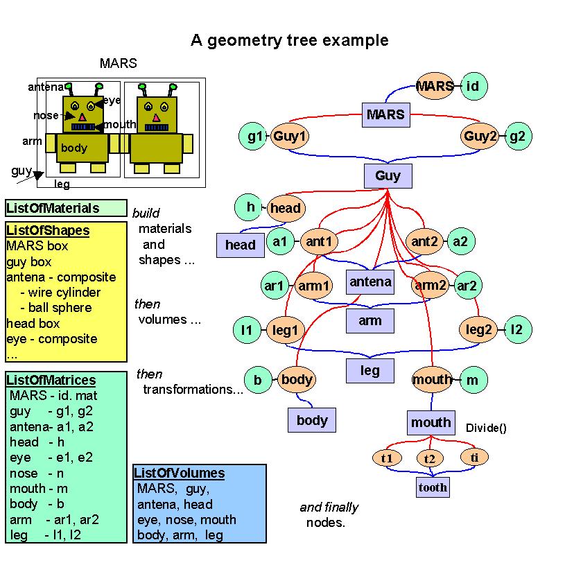 elements in the hierarchy of volumes. Nodes are unique and distinct geometrical