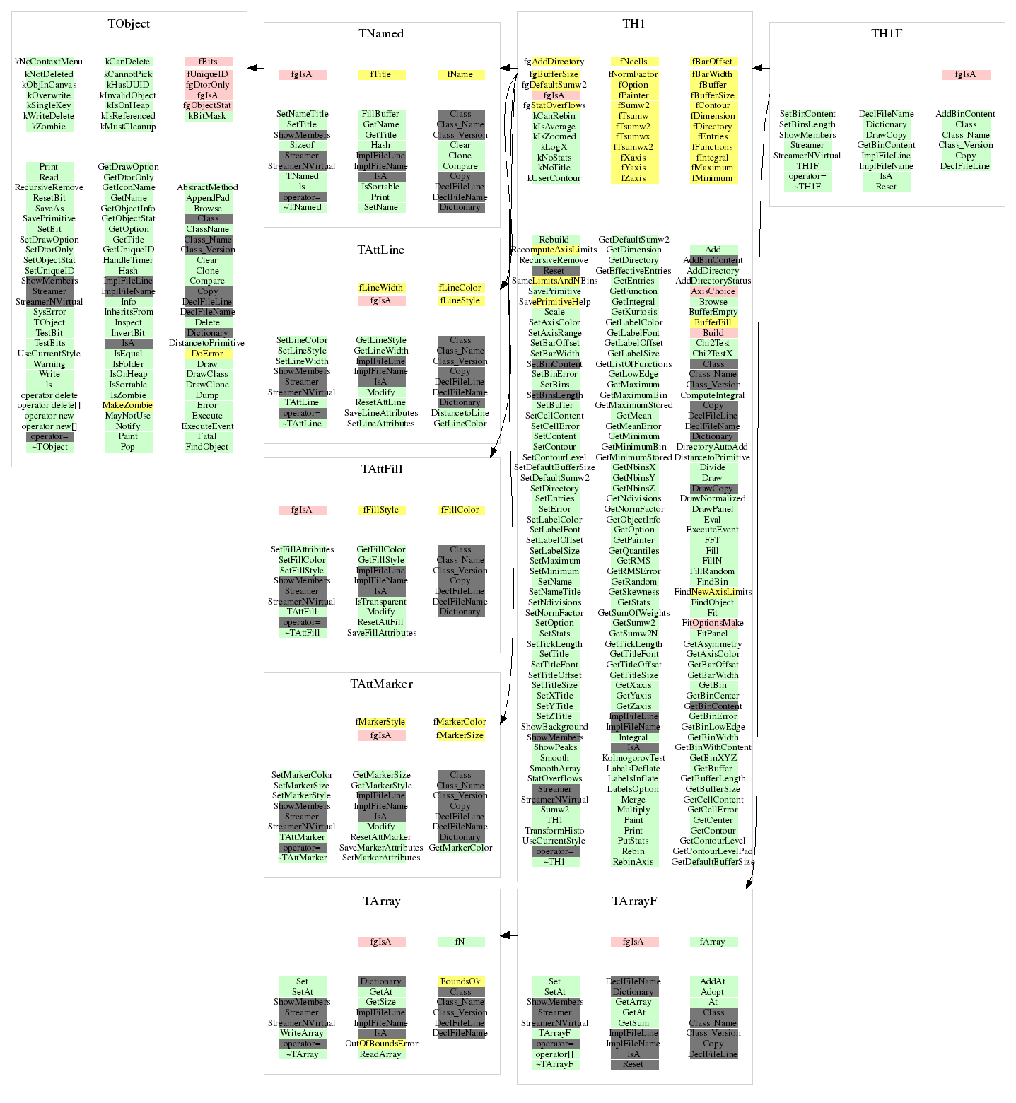TH1 ^ | | | ----------------------------------------------------------- | | | | | | | | | TH1C TH1S TH1I TH1F TH1D | | | | | | | TH2 TProfile | | | | | ---------------------------------- | | | | | | | TH2C TH2S TH2I TH2F TH2D | | TH3 | | TProfile2D | ------------------------------------- | | | | | TH3C TH3S TH3I TH3F TH3D The TH*C classes also inherit from the array class TArrayC. The TH*S classes also inherit from the array class TArrayS. The TH*I classes also inherit from the array class TArrayI. The TH*F classes also inherit from the array class TArrayF. The TH*D classes also inherit from the array class TArrayD.