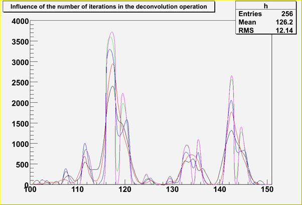 TH1F *h = new TH1F("h","Influence of # of iterations in deconvolution in peak searching",nbins,xmin,xmax);