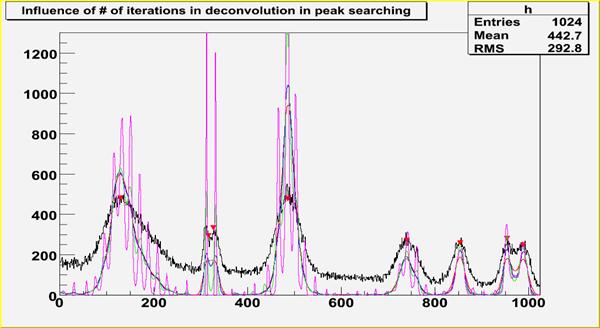 // Example to illustrate the influence of number of iterations in deconvolution in high resolution peak searching function (class TSpectrum).