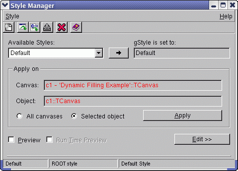 The combo box 'Available Styles' contains the list of available styles for the current ROOT session and shows the currently selected one. The field on the right shows the setting of the gStyle. You can set the global variable gStyle to the selected style by clicking on the button in the middle. The group frame 'Apply on' displays information for the currently selected canvas and object in the ROOT session. This selection might be changed by clicking on another object with the middle mouse button. You have a choice to apply a style on the selected object or on all available canvases. WARNING: You cannot undo the changes after applying the style! If you are not sure of that action, it may be better to see a preview of what you are going to apply. If the check button 'Preview' is selected, a preview of the selected canvas according to the selected style will be shown. The selection of the next check button 'Run Time Preview' will apply updates of the preview any time a value of the selected style is changed. For drawings that take a time it is better to disable this option. Create a new style: A new style can be created via the Style menu/New... or the toolbar. A clone of the selected style will be used as a base of the new style. All its values can be modified via the style editor later. The dialog that appears will ask for the name and description of the new style. Import a style (from a macro): A style macro can be imported at any time. The new imported style in the ROOT session will become the selected one. Import a style (from a canvas): You can do that selecting the Style menu/Import from.../Canvas or the corresponding Tool bar button. A new style will be created in the ROOT session and will become the selected one. This style is a clone of the gStyle with modified values as they are set in the currently selected canvas. You can import a style from any canvas and apply it later on some objects. Export a style (in a C++ macro file): To store a style longer than for the current ROOT session you can save it in a C++ macro file. This can be done via the menu or the tool bar button. There is a naming convention for the style macros: the name must be 'Style_*.C', where * can be replaced by anything you want. Delete a style: The selected style can be deleted from the list when you use the Style menu/Delete or the corresponding tool bar button. The selected style is removed from the list of all available styles for the current ROOT session. WARRNING: it will be lost if you didn't saved it in a C++ macro file before its deletion. Also, you cannot delete the selected style if it is set to gStyle. A message 'Can not delete gStyle' will be displayed on the CINT prompt./*